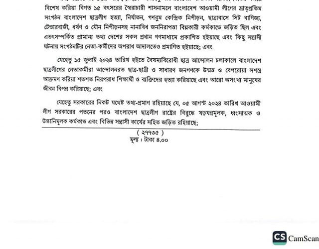 ছাত্রলীগ নিষিদ্ধ করে প্রজ্ঞাপন জারি